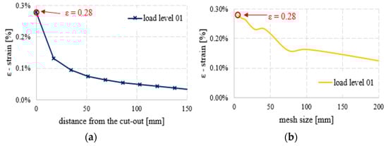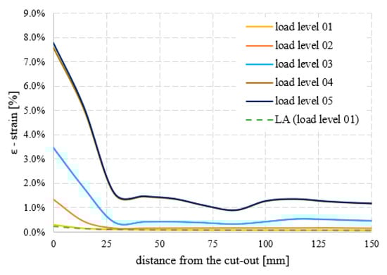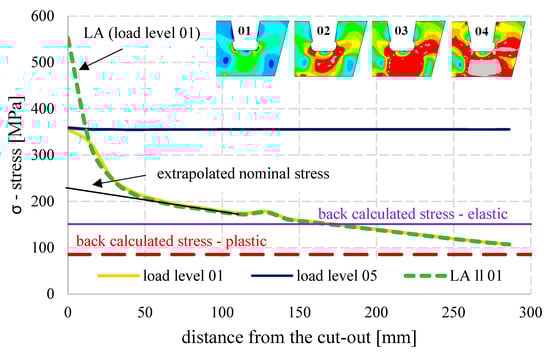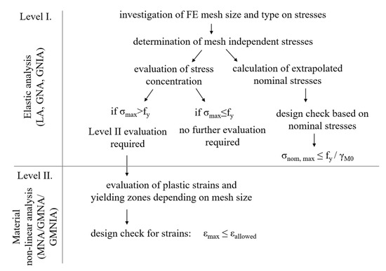 - If the results of the linear analyses show the maximum stress (σmax) is larger in the stress concentration zone than the yield strength of the applied steel material, further investigations should be carried out to investigate the maximum strains within the stress concentration zone using non-linear analysis and an elastic–plastic material model. The distribution of stresses and strains is investigated at load level 01.
