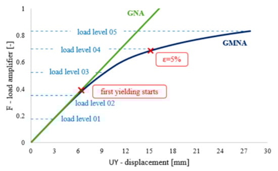 - Geometrical and material non-linear analysis is performed to determine the load-carrying capacity of the analyzed detail. The load–deformation path of the structure is evaluated. The ultimate load and the end of the linear behaviour are both determined. The end of the linear behaviour is calculated based on a comparison of GMNA (geometric and material non-linear analysis) and GNA (geometric non-linear analysis) analysis.