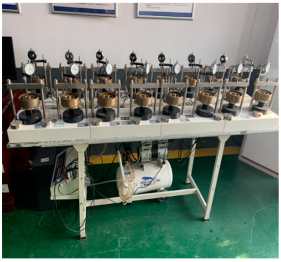 Firstly, manually input and proofread 14 test soil sample numbers and corresponding ring cutter numbers in the data acquisition system, and select and confirm the loading series and test methods. Then, in order to ensure the smooth progress of the test and the range of the displacement sensor, it is necessary to carry out zero correction operation, and confirm that the dial indicator pointer points to the 5–9 mm area. Finally, start the experiment and save the data file. In addition, set the program system to record data 12 times within one hour, and the data collection period after one hour is half an hour.