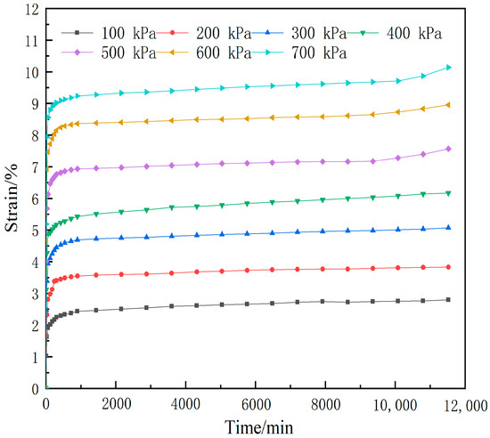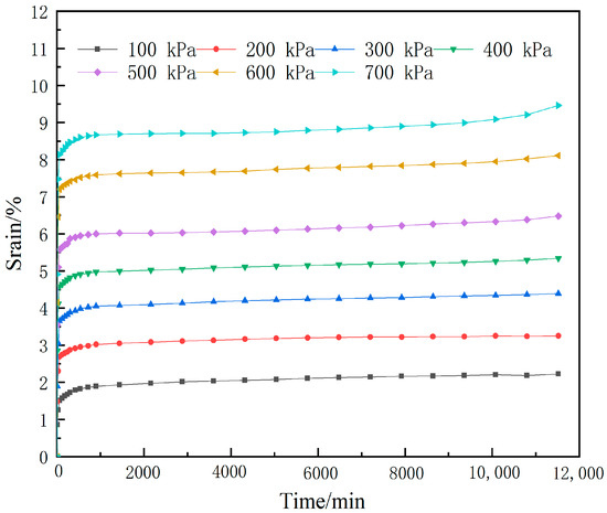 According to the test data listed in Table 5, the relationship between strain and time of silty clay under different vertical loads was obtained (Figure 4). It can be seen from Figure 4 that the silty clay has a similar phenomenon. When the vertical load was 100 kPa, the creep strain of the soil sample was 0.88%. When the loading reached 700 kPa, it increased to 1.58%, as shown in Table 6.