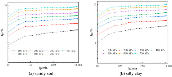 Logarithmic coordinates were used instead of ordinary coordinates, as shown in Figure 5. As can be seen from Figure 5, the strain curves of both sandy soil and silty clay are broken lines, and the time corresponding to the inflection point of the broken line is t = 60 min, indicating that the primary consolidation process was completed in 1 h. According to Table 4 and Table 6, the average deformation corresponding to the completion of primary consolidation in each group (A and B) is 82.47% and 78.22%, respectively.