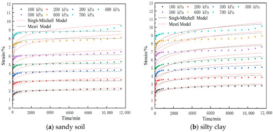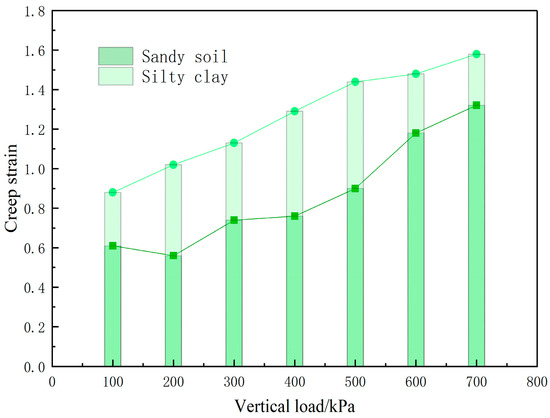 The relationship of the stress–creep strain curve of the soil sample is drawn based on the test data, as is shown in Figure 6. From Figure 6, it can be seen that the creep deformation of soil samples under confined loading conditions is positively correlated with loading stress. With the same experimental conditions, the creep deformation of silty clay is larger than that of sandy soil.