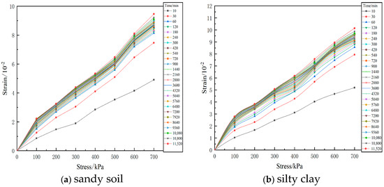 Figure 7 shows the isochronous curves of sandy soil and silty clay. It can be seen that the isochronous curves approach the longitudinal axis (strain axis) with the increase in time. After 60 min of loading, the corresponding curves at different times roughly coincide with each other, but the offset is small, indicating that the creep characteristics of soil samples become more obvious with the increase in time in the process of secondary consolidation.