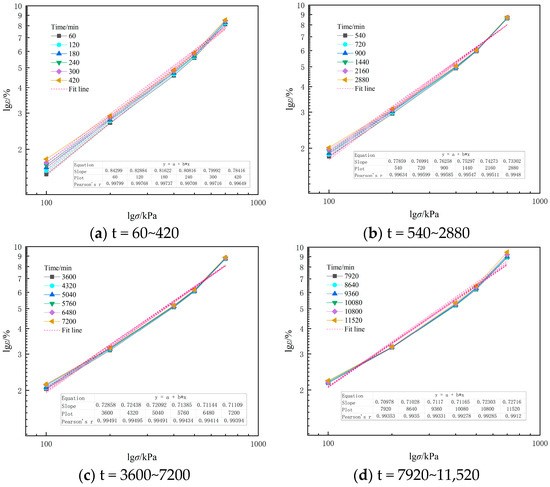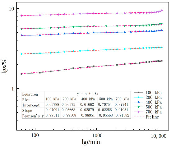 According to the study above, secondary consolidation deformation of Changsha sandy soil occurred 1 h later after loading. Extracting the creep test data from 60 to 11,520 min draws the lgε-lgt curve in Figure 9. “Pearson’s R” index was selected to judge the fitting effect of the curve. It can be seen from Figure 9 that the manifestation of creep curves in logarithmic coordinates is linear, and the fitting line has a high degree of coincidence with the experimental curve, with the correlation coefficients ranging from 0.9158 to 0.9951. On the basis of the lgε-lgt curve, the relation between creep strain and time can be obtained as follows: