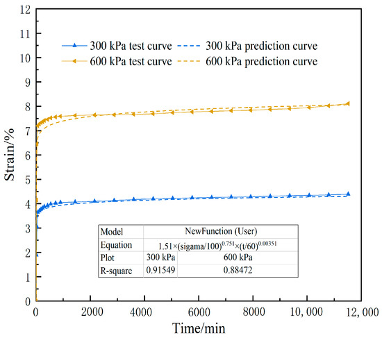 Not only can a good model reflect some corresponding relationships in the prototype, but it also will have good application and extension performance. In order to verify the rationality and accuracy of the empirical creep model of the sandy soil, the creep curves under vertical loads of 300 kPa and 600 kPa were predicted based on the established empirical creep model. The prediction results of the model are shown in Figure 11.