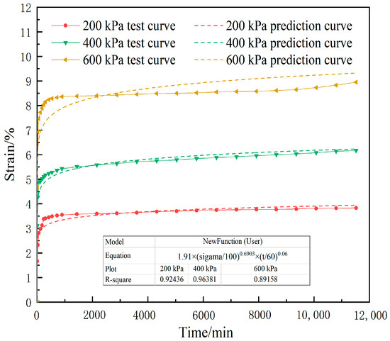 As can be seen from Figure 12, when σ = 200 kPa and 400 kPa, the predicted curves were in good agreement with the creep test curves, with R2 being 0.9244 and 0.9638, respectively. When σ = 600 kPa, the predicted curve of the model was not in good agreement with the creep test curve, and the R2 was 0.8916. The reason is that silty clay exhibits a nonlinear creep phase under stresses of over 500 kPa. The prediction results indicate that the empirical creep model can predict the creep curve well and the fitting accuracy is high in a certain range of load. It can also be seen from Figure 10 and Figure 11 that the predicted value is less than the measured value of creep at the initial stage of creep (decelerated creep stage), but it is greater when at the middle and late creep stage (steady speed stage and accelerated stage). It indicates that the model may do a poor job of predicting in the accelerated creep stage.