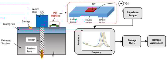 The schematic of the admittance-based technique for crack detection in a prestressed anchorage is illustrated in Figure 1. This technique relies on measuring the changes in the mechanical impedance of an anchorage caused by damage [31,32]. To apply the technique, a piezoelectric device is bonded to the bearing plate of a prestressed anchorage. Afterwards, the admittance response of the anchorage is periodically measured in a predefined frequency band using an impedance analyzer. Next, statistical damage metrics are computed to estimate changes in the admittance spectrum. Finally, the structural integrity of the anchorage is then assessed using the calculated damage metrics.