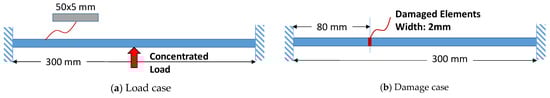 We conducted numerical simulations to examine the feasibility of using the admittance response of the piezoelectric interface for identifying load changes and cracks. To simplify the model, we selected a fixed–fixed beam as the host structure, as illustrated in Figure 2. The beam had a uniform cross-section of 50 × 5 mm and a length of 300 mm. To simulate the effect of loading on the admittance response, we placed a concentrated load at the midpoint of the beam, as shown in Figure 2a. We sequentially investigated three levels of the concentrated load P = 0 (i.e., the intact case), 1 kN, and 2 kN. In the next simulation, we introduced a crack into the beam at a distance of 80 mm from the left end, as shown in Figure 2b. The crack had a width of 2 mm and was simulated by reducing the Young’s modulus of the damaged elements. We simulated three crack cases, including the intact case, 20% stiffness loss, and 40% stiffness loss.
