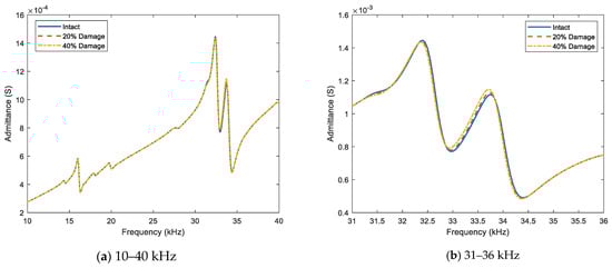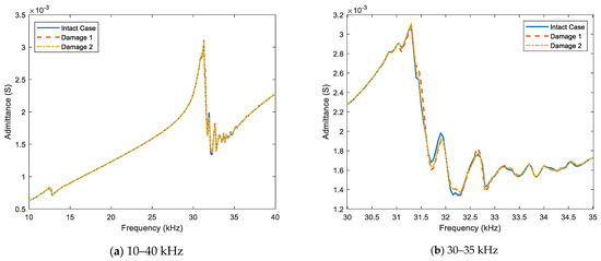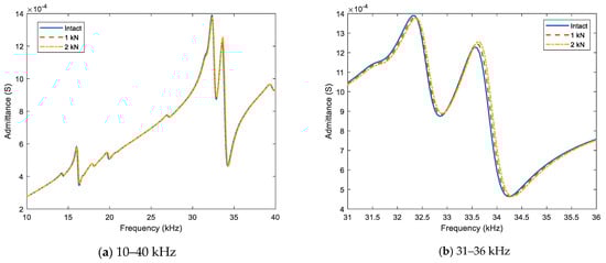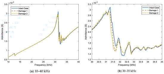 Figure 10a displays the absolute value of the admittance response of the PZT interface under the second testing scenario. As shown in Figure 10b, the admittance response in the frequency band of 30–35 kHz shifted to the left due to the damage, resulting from the reduction in modal stiffness. This experimental observation was consistent with the numerical simulation results. As compared to the result in Figure 9b, the admittance response in Figure 10b exhibited considerable changes due to the damage. This was expected, as the damage in the second test scenario was closer to the PZT interface, and there was no obstacle between the damage and the transducer, enabling the generated elastic wave to easily propagate to the damage’s position with less attenuation and greater sensitivity. The admittance shift was found to increase with damage severity. These experimental results confirmed the reliability of the numerical simulation results in Section 3, and the use of the PZT interface technique ensured the consistency of the measured admittance responses, regardless of the target structure.