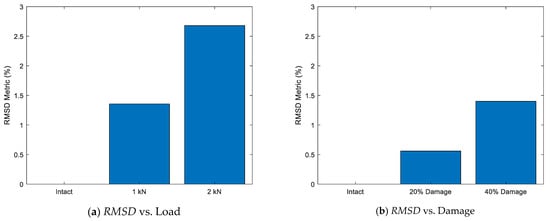 The RMSD metric was computed for both loading and damage cases. The entire frequency range of 10–40 kHz was used to calculate the metric, and the results are displayed in Figure 6a and Figure 6b, respectively. It is shown that the RMSD metric was almost zero for the intact case but significant for the damage and the applied load cases. The metric increased with the severity of the damage or the applied load. It is shown that the stress change and the presence of a crack in the host beam can be detected based on the evolution of the RMSD metric.