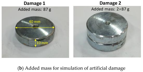 A damage simulation technique using adding masses was adopted to simulate the structural damage in the anchorage. This technique can physically model the stiffness loss in the anchorage resulting from crack or corrosion damage without damaging the test structure [25,47,48]. Figure 7b shows the added masses used in this experiment. A single mass block has a cylindrical shape with a height of 10mm and a diameter of 40 mm. Damage 1 used a single mass block with a weight of 87 g, while Damage 2 used two mass blocks with a total weight of 174 g. The masses were magnetically attached to the bearing plate’s surface of the tested anchorage, as shown in Figure 8.