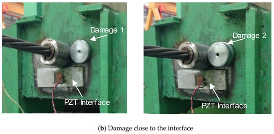 Two testing scenarios were simulated. In the first scenario, the masses were placed right above the anchor head to simulate Damage 1 and Damage 2, as shown in Figure 8a. It was noted that the interface was placed below the anchor head. The center-to-center distance between the transducer and the damage was 102 mm. This test aimed to examine the detectability of the PZT interface for distant damage when the wave propagation was scattered by the anchor head. In the second scenario, the masses were placed at the right side of the anchor head, close to the bonded section of the piezoelectric interface. Damage 1 and Damage 2 were simulated, as shown in Figure 8b. The center-to-center horizontal and vertical distances between the transducer and the damages were 33 mm and 40 mm, respectively. In the second scenario, it was noted that the space between the transducer and the damage had no obstacles.