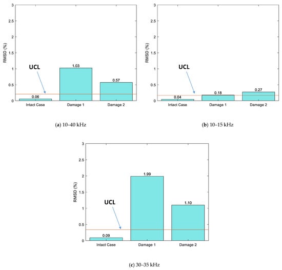 The results for the second testing scenario for the same three frequency ranges are shown in Figure 12a–c. Similar to the first scenario, the intact case showed negligible RMSD values, while the damage cases showed significant values above the UCL thresholds, indicating successful damage detection. In contrast to the distant damage case in the first scenario, both 10–40 kHz and 30–35 kHz showed linear changes in the RMSD metric for the second scenario. The RMSD of the 10–15 kHz band showed an increase under Damage 1 but a slight reduction under Damage 2.