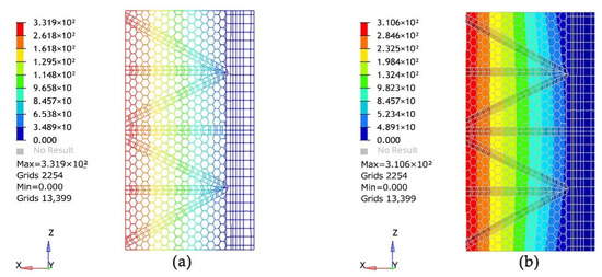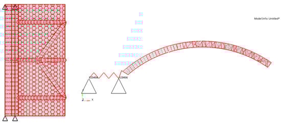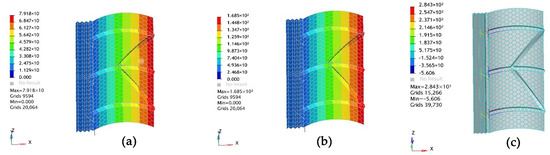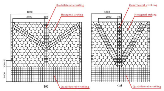 The double carport conventional size is 5000 (L) × 6000 (D) × 2100 (H) mm/5500 (L) × 5500 (D) × 2100 (H) mm with a vehicle spacing of not less than 4800 mm, so the design of double carport, as shown in Figure 3, for the two model sizes is 11,200 (L) × 6600 (W) × 3626 (H) mm. Moreover, according to the actual design of the carport, the hexagonal grid with a sagittal-to-span ratio of 1/6 is chosen for the overall arching, the wrinkle height is 200 mm, the carport skeleton size is taken as 50 × 50 mm, the membrane fabric is taken as 2 mm, the displacement constraint is applied along the length of four grids on the left and right of the structure and the uniform load is F = 1000 N/m2. The quadrilateral wrinkling and hexagonal overall arching under load can transfer the force of the load to the fixed end of the carport to reduce the load of the carport, and the V-shape formed by the wrinkling can be used as a natural drainage channel under rain and snow to further reduce the pressure of the carport.