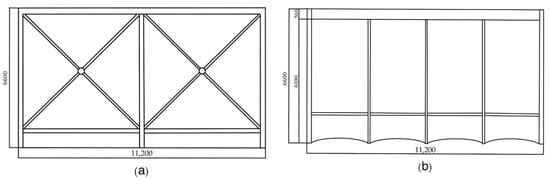 To investigate whether the stiffness of the bionic dragonfly wing shelter is further improved, we have drawn the floor plan of the two types of shelters according to the results of field survey measurements, as shown in Figure 5, and established a finite element model. To compare the results as accurately as possible, the dimensions of the flat-top and hat-top shelters are the same as those of the bionic shelter model. The model uses 220 mm I-beam steel as the shelter pillar, 50 × 50 mm steel as the internal roof structure and Q235 steel as the steel pipe material. We plan to observe the displacement values of the flat-top, hat-top and bionic shelters under three different extreme loads to determine whether the bionic wing shelter further improves the stiffness of the shelter.