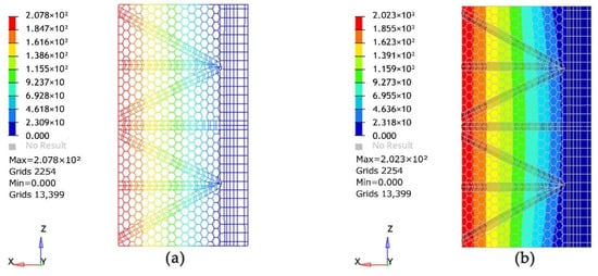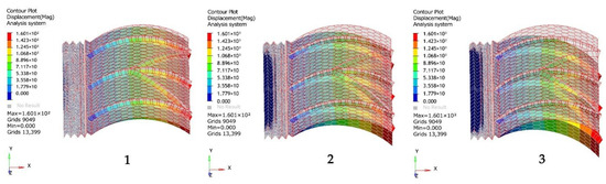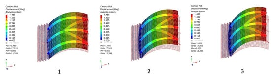 The structure of the dragonfly wing bionic carport model I was imported into the OptiStruct finite element software for modeling and mechanical simulation. To facilitate the comparison of the deformation of each structure of the two models, the two bionic carport models were subjected to displacement constraints on the left and right of the structures, and the effects of uncertain loads under natural conditions were considered, where a larger mean load of F = 1000 N/m2 was taken for the nonlinear static analysis. Figure 9 shows the numerical plot of the maximum deflection of model I under self-weight.