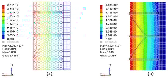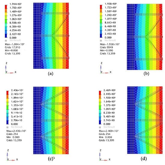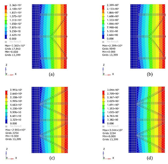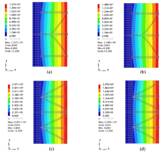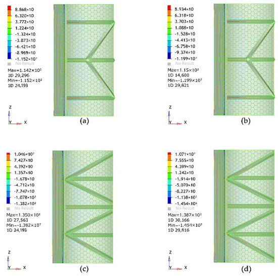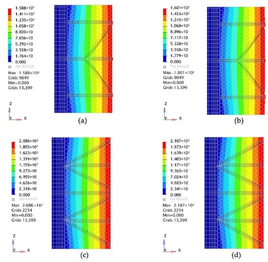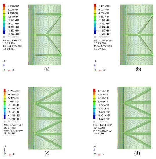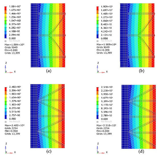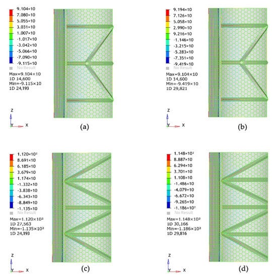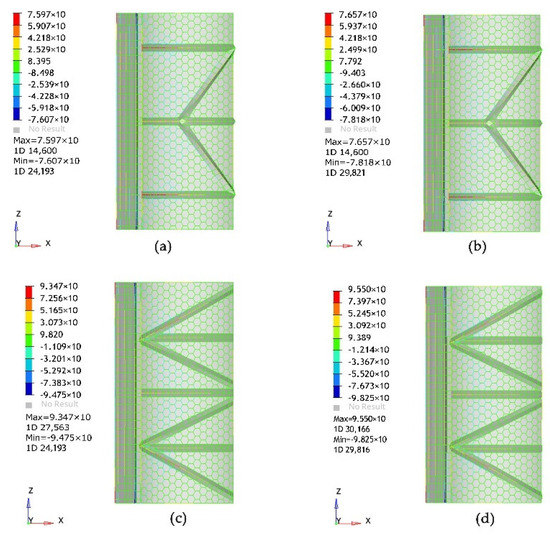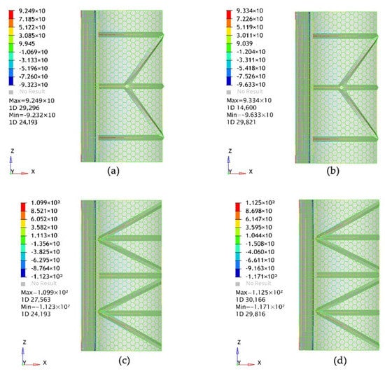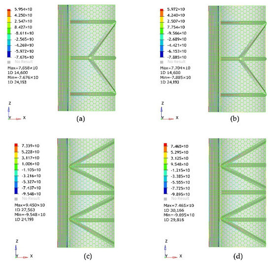 Figure 19. (a) Linear stress analysis of the carport I model under the load of 1.2 Gk + 1.4 × 0.85 QS + 1.4 QW; (b) Nonlinear stress analysis of the carport I model under the load of 1.2 Gk + 1.4 × 0.85 QS + 1.4 QW; (c) Linear stress analysis of the carport II model under the load of 1.2 Gk + 1.4 × 0.85 QS + 1.4 QW; (d) Nonlinear stress analysis of the carport II model under the load of 1.2 Gk + 1.4 × 0.85 QS + 1.4 QW under carport II model nonlinear stress analysis.