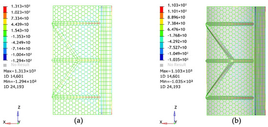 The carport is subjected to an external load and the internal skeleton generates a reaction. Figure 11 shows the tensile and extrusion trend of the bionic carport model I under the action of self-weight plus an external load.