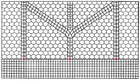 The numerical design of the vehicle charging carport roof structure based on the biomimetic grid pattern utilizes a 200 mm side length for the quadrilateral grid and a 400 mm diameter for the hexagonal grid, as shown in Figure 2a. The carport adopts the quadrilateral grid, which produces wrinkles on the surface. Three main support structures form a triangle to divide the roof into two equal parts, with the central axis providing the arching effect and distributing the load evenly to both sides of the carport. Figure 2b shows the carport plan divided into four triangles, which make reasonable use of the stability principle of triangles. The carport diverges from the central axis to both ends, effectively distributing the load of the carport. Compared to carport II, carport I disperses the load from the arching point of the central axis to both ends. In carport II, the three main load-bearing axes at the wrinkling point divide the carport into larger triangles of equal size. Both carport grid designs are based on the stability principle of triangles and reference the actual carport frame structure.