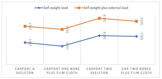 Figure 29. Folding line diagram of combined displacement of two carports under self-weight and self-weight plus an external load. The data in the figure are obtained from the simulation results of finite element software.