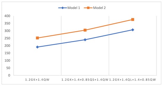 The steel membrane structure canopy is not designed for floor activities. According to the formula for the load combination of the charging station canopy, and considering the actual situation of the canopy, we can determine that the significant loads that the canopy will face under natural conditions are wind load and snow load. Based on the “Code for Load of Building Structures” GB50009-2012, which is the load standard for structural design, we investigated the average values of natural condition loads in southern areas, including Nanchang and surrounding areas in Jiangxi, over a 50-year period. We summarized several combinations of natural working conditions in Table 4 to facilitate the determination of the canopy’s load and stiffness testing under different situations. We also calculated the extreme weather load occurring once in 50 years and added it to the load design to ensure the authenticity and effectiveness of the data simulation.