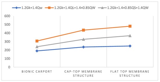 The greatest value of the live load QL is taken as 0.7 kN/m2 for the calculation. The membrane carport is designed to withstand 0.5 kL of live load on the horizontal projection surface of the carport according to the load standard for all carport members. The wind load is the pressure exerted by air flow on an engineering structure, the magnitude of which is proportional to the square of the wind speed [44]. The standard values of wind loads are the average wind pressure plus the equivalent wind pressure caused by pulsating wind, resulting in the wind vibration of the structure, and the average wind pressure multiplied by the wind vibration coefficient βz, respectively. The building structure is subject to wind loads related to the size, sea-level height and wind speed and direction, where the standard value of wind load acting vertically on the unit area of the building surface is wk (kN/m2), calculated as follows: