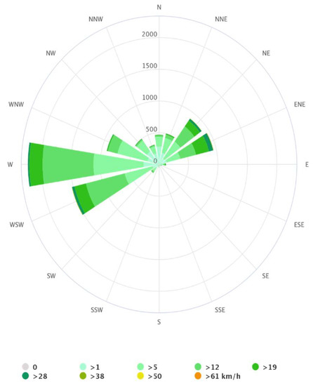 The North Cyprus wind rise shows the yearly hours in kilometers per hour (Km/h) that a certain wind direction blows (Figure 7). The direction of the prevailing wind should be considered when choosing the optimal orientation for a building’s design since wind-resistant buildings that utilize natural ventilation will benefit from being orientated in that direction. The wind rises in North Cyprus demonstrate that the wind generally blows from the SW to the NE, which is important information for constructing structures that take advantage of the prevailing wind direction.