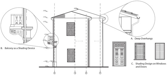 As seen in Figure 5 and Figure 8, both study houses use deep overhanging approaches in different contexts. Typical Mediterranean houses use deep overhangs (A), window shading (C), and extended balconies as shading devices as their primary means of shade (Figure 9). In contrast, the primary characteristic of the contemporary house is their flat (terrace) roofs and indoor shade. The study attempts to identify dwellings that share the same or similar environments, and in both instances, the dwellings have deep overhangs for shade.