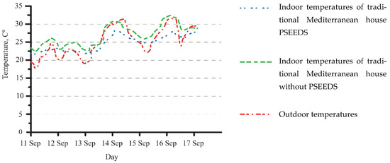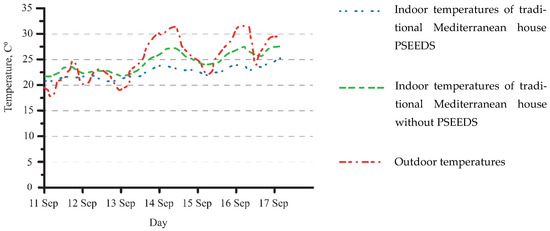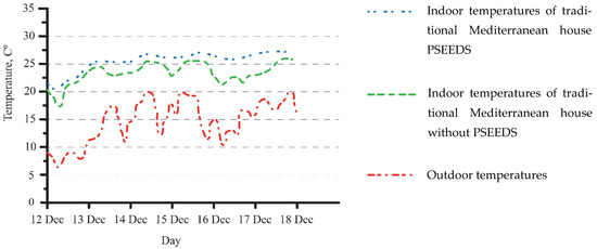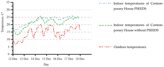Indoor–outdoor temperatures shown in Figure 11 represent the temperature of traditional Mediterranean houses with and without PSEEDS and Figure 12 shows the indoor–outdoor temperature of contemporary houses with and without PSEEDS, and there is no HVAC operating during the study. Comparing the indoor temperature of both actual houses turned out that the contemporary house shows a minor fluctuation. The traditional Mediterranean house maintains the indoor and has a more constant temperature. The reason has been explained in the previous section (the traditional Mediterranean house has a ticking wall with high thermal mass) and because of that, the heat gain is not easily lost.