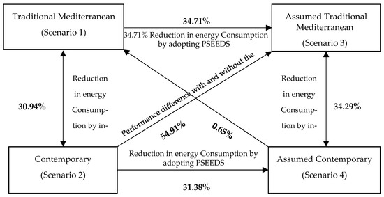 As shown in Table 4, a significant reduction in energy consumption has been registered as the results obtained from the simulation program. By adopting PSEEDS, 31.38% energy conservation has been achieved in the annual heating and cooling energy usage. Individual heating loads have conserved 73% per year. Although yearly cooling loads only saw a minor improvement of 6.1%, these outcomes are comparable to those shown for the traditional Mediterranean (scenarios 1 and 3). But compared to the traditional Mediterranean, the contemporary house with PSEEDS appears to have minor energy consumption throughout the winter. This shows that contemporary houses with the integration of PSEEDS have less efficiency to maintain the indoor environment. This is simply because the traditional Mediterranean house has a high thermal mass in comparison to the contemporary house. The thermal mass helps to maintain the heat loss in all seasons, and because of that, the traditional Mediterranean house takes advantage of the contemporary house in addition to PSEEDS.