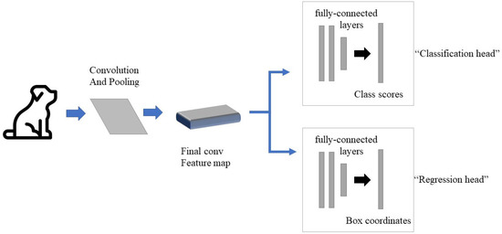 Most recent object detection studies are focused on the use of a CNN for typical model applications in which a matching object is identified before determining in which area a matching thing exists and tagging the location of highest probability with a box, as shown in Figure 2. Two fully connected layers are connected behind the CNN, one for classification and the other for tagging the matching area. There are three algorithms to organize an area: sliding window, region proposal, and grid-based.