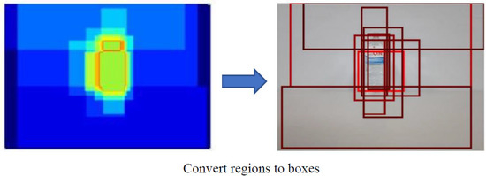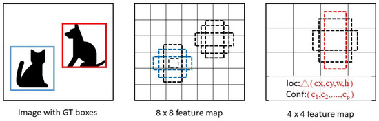 The size and length–width ratio require consideration for testing the box on a feature map. Every grid on the feature map is scanned to generate corresponding testing boxes (Figure 13). During the training, the ground truth in the picture is checked to match the testing box. The best-fit box is filtered based on intersection over union (IOU). The exact positive and negative sample ratio is close to 1:3. The loss function depends on the weights of location error and confidence error. Data enhancement is carried out via horizontal flipping, random cutting, color twisting, and random sampling of block regions. Top-k prediction boxes with high confidence levels are reserved during the prediction before the object detection algorithm of non-maximum suppression (NMS) is used to filter prediction terms with significant overlapping. The prediction term left at the end is the result [36].