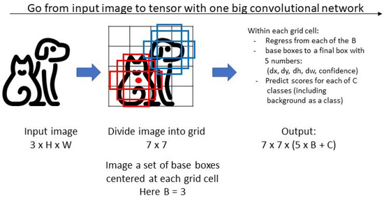 - Grid-based regression: a picture is divided into grids, and regions of various sizes are selected with the grids as centers. Regression determines the probability that every bounding box contains the target. This approach is suitable for real-time detection. Similar algorithms are you only look once (YOLO) and single shot multibox detector (SSD) [35], as shown in Figure 5.