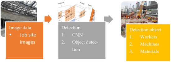 Most general contractors deploy imaging devices, such as photo and video cameras, to document the progress of construction activities throughout the entire process. The image data are collected, in general, by filming with a mobile camera operated by a worker or a video camera set up at a fixed location. Most image data collected are used passively for reference or even just shelved. The others are used to prepare quality documents or demonstrate construction status and progress. Suppose artificial intelligence (AI) is introduced to recognize objects in the images and help job site management identify and tag things in the images. In that case, these image data may serve as an essential basis for decision-making within construction activities, including construction planning and design, job site safety, automated equipment management [7,8,9,10], and quality monitoring and maintenance. For example, suppose a specific machine is tagged in video footage of construction activities [11]. In that case, the project team may exploit the captured data for project decisions of route management, machine setup, and site safety [12,13,14,15].