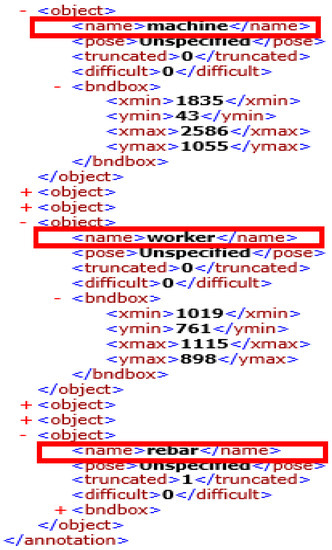 Two types of files were generated after tagging with LabelImg; one was the image files themselves, and the other was the XML files with image locations tagged. In Figure 10, for example, workers, rebars, and machines are tagged and given specific names in the image. Figure 11 provides an example of the contents of the XML file, including dimensions such as image coordinates. The single shot multibox detector (SSD) deep learning model was established and tested as all images were tagged.