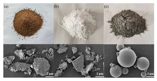 The appearance and microscopic images of raw materials: (a) soft soil; (b) slag; and (c) fly ash.