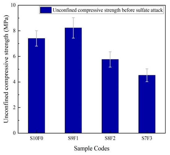 The UCS of the SF-GSSS before immersion in a sulfate solution is given in Figure 4. It is stated that the UCS of SF-GSSS exhibits a development trend that first starts with a small increase and then a larger decrease with the increase in fly ash admixture in the geopolymer precursor materials. The UCS of S10F0, S9F1, S8F2, and S7F3 were 7.405, 8.228, 5.760, and 4.525 MPa, respectively. With S10F0 as the control group, the strength growth rate of S9F1 was 11.1%, while the strength decrease rates of S8F2 and S7F3 were 22.2% and 38.9%, respectively. The growth of the strength of the samples by the appropriate amount of fly ash can be attributed to both the geopolymerization enhancement and lubrication effect. The specific significance of geopolymerization enhancement is that fly ash that is rich in silica-alumina mineral components can provide a large amount of reactive SiO2, Al2O3, and Ca2+. These compounds are provided by the slag undergoing a geopolymerization reaction under the catalytic effect of the composite alkali activator to produce more representative geopolymer gelling products, such as calcium silicate hydrate (C-S-H), the calcium silicate aluminate hydrate (C-A-S-H) of calcium-based hydration products, and the sodium-based hydration products consisting of sodium silicate aluminate hydrate (N-A-S-H). In addition, these products effectively improve the strength of the samples [].