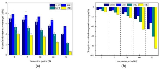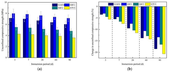 (a) The UCS of SF-GSSS immersed in Na2SO4 solution at different times. (b) Change in UCS.