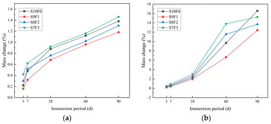 Mass change in SF-GSSS at different immersion periods: (a) Na2SO4 solution and (b) MgSO4 solution.