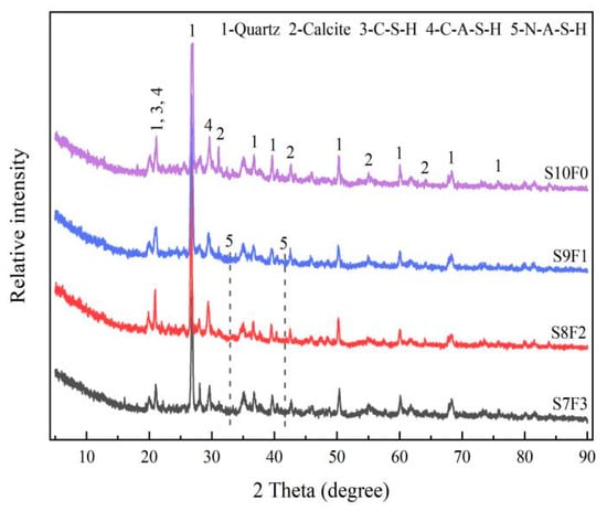 The XRD patterns of the SF-GSSS before a sulfate solution attack are given in Figure 8. The SF-GSSS with different slag/fly ash ratios are composed of a large number of crystalline and amorphous phase products. The mineral components of S10F0 consist mainly of quartz, calcite, and calcium-based hydration products such as C-S-H and C-A-S-H. This is in agreement with the findings reported in the literature [,], where C-S-H and C-A-S-H allowed an effective development of the early strength of the samples. Quartz may be derived from soft soil and precursors, which are not involved in the hydration of geopolymer, while calcite formation may be due to the carbonation of the sample during curing. The sodium-based hydration product (N-A-S-H) was obtained in S9F1, which explains the effective improvement of the strength of S9F1 when compared to S10F0. The intensity of the diffraction peaks of C-S-H and C-A-S-H in S8F2 and S7F3 gradually decreased with the increase in fly ash admixture in the precursor materials, which can be explained by the difficulty of the chemical reaction between the N-A-S-H with a dense structure and strong chemical stability and the slag-based geopolymer gel products, which inhibited the development of a slag hydration reaction [,].