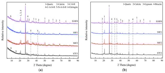 Figure 9 shows the XRD patterns of the SF-GSSS exposed to Na2SO4 or MgSO4 solutions for 60 days, respectively. Figure 9a demonstrates that the mineral phases of the samples did not change significantly after the attack of the Na2SO4 solution. This is in accordance with the study of Zhang et al. [], where trace amounts of ettringite were found in S10F0, which was mainly attributed to the slight decalcification and dealumination of the calcium-rich silicate gel by Na2SO4 attack. The mineral phases of S9F1 and S8F2 were identical to those before immersion, and no ettringite was generated, which can prove that the blending of the appropriate amount of fly ash can improve the resistance of the samples to Na2SO4 attack. The above phenomenon may be related to the structural stability of N-A-S-H and the decrease in the Ca/Si ratio in C-A-S-H []. However, the presence of ettringite in S7F3 suggests that the excessive fly ash admixture has a detrimental effect on the resistance of the samples to Na2SO4 attack. It can be explained that the higher porosity of S7F3 makes it easy for the Na2SO4 solution to penetrate into the sample, which accelerates the decalcification and dealumination process of C-A-S-H.