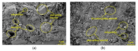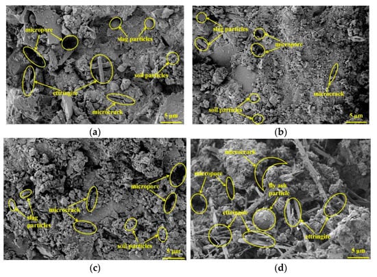 Figure 10 shows the SEM images of the SF-GSSS before sulfate attack. The plate-like gelling substances were found in S10F0, which completely encapsulated soil particles and filled the excess pores of the internal structure of the soil to form stable soil agglomerates, resulting in enhanced internal structural compactness. The rest of the gels were interconnected after solidification and hardened to form a geopolymer stabilized soil space structure system []. The two together effectively improved the mechanical properties of the soil. It is important to note that there were a few microporous defects in S10F0, which were mainly due to the geopolymer slurry setting and hardening too fast during the mixing process, and due to its poor fluidity making it difficult to make full contact with the soil. With the incorporation of fly ash, flocculent gelling substances were found in S9F1, and the structural denseness of the specimen was further enhanced with an intact surface. Few fly ash particles and slag particles were found around the gelling substances in S8F2 and S7F3, which are mainly fly ash with lower activity and dense structures, resulting in them consuming more of the alkali activator []. Moreover, the N-A-S-H structure makes it difficult to react again with the hydration of the slag-based geopolymer gel products []. Fly ash and slag particles that did not participate in the geopolymerization reaction were present in the soil in a physically filled manner, increasing the porosity of the specimen. Compared with S8F2, the microstructure of S7F3 was sparser and more porous, and the integrity was reduced.