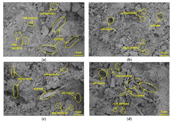 The SEM images of SF-GSSS after 60 days of exposure to a MgSO4 solution are given in Figure 12. Obviously, gypsum was found in S10F0, S9F1, S8F2, and S7F3 with different distribution ranges. It can be inferred that gypsum is the main substance produced after the attack of SF-GSSS by a MgSO4 solution. With the continuous accumulation of gypsum, the generated expansion stress grew gradually until it was larger than the maximum load-bearing capacity of the pore wall, which lead to different degrees of damage to the microstructure of the samples. A relatively high number of hole defects were found in S10F0. The gelling substances inside S9F1 and S8F2 were significantly reduced, and their cementitious properties to soil particles became poor, making the overall structure loose and porous with a sheet-like stack. In particular, more cracks were generated in S8F2. The decrease in cementation property was mainly due to the conversion of C-S-H, C-A-S-H, and N-A-S-H to M-S-H and M-A-S-H after the replacement of alkali metal cations by Mg2+, which has poorer mechanical properties and weaker cementation []. A large amount of disordered gypsum was found in S7F3, and the internal structure of the specimen had completely lost its integrity and transformed into a hollow structure.