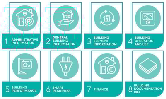 - European Commission. Definition of the Digital Building Logbook. In Report 1 of the Study on the Development of a European Union Framework for Buildings’ Digital Logbook; European Commission: Brussels, Belgium, 2020. [Google Scholar]