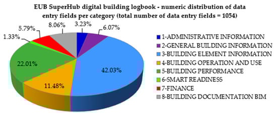 A significant shortage of information regarding real estate assets, ranging from individual buildings to neighbourhoods and cities, has been identified in Italy. Dejaco et al. [] have proposed building and district logbooks as tools for collecting, organising, and managing information, with the aim of streamlining the real estate management process. The proposed logbooks, conceived as tools for risk management, could be intended as rigid control tools. The performed analysis of the literature on the defined DBL data structure revealed that only four EU-funded projects, namely iBRoad [], ALDREN [,], BIM4EEB [,], and X-tendo [,], have suggested a DBL data structure. The digital building logbook developed within the iBRoad project covers single-family houses, while the one developed within the ALDREN project covers office buildings and hotels. In July 2020, the European Commission published Report 1 of the “Study on the Development of a European Union Framework for Buildings’ Digital Logbook” [], which recommended a DBL data structure containing eight main categories and emphasized the importance of having a common DBL for the entire building stock. Therefore, the consortium teams working on the EUB SuperHub project developed a digital building logbook data structure, that covers the entire building stock throughout the building life cycle.