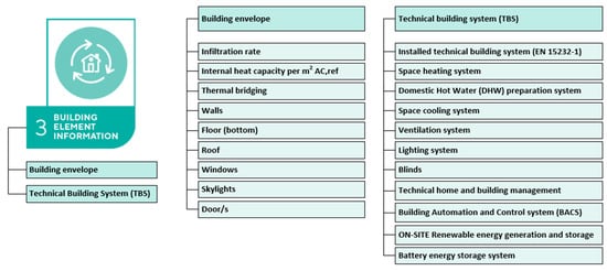 The four listed EU projects, in their deliverables [,,,,,,], defined a digital building logbook data structure (main categories and subcategories). Table 2 gives an overview of the main categories of DBL defined within those four EU projects and the main categories suggested in Report 1 of the “Study on the development of a European Union Framework for Buildings’ Digital Logbook”, published by the European Commission in July 2020 [].
