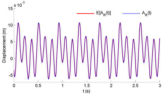 If the values of , , and are negligible, such as , , and , Figure 6 shows the displacement response of the structure. When the deviation of the random variables , , and are small, the deterministic displacement is equal to the mean of the random displacement as presented in Figure 6, which meets the expectation. To some degree, this also verifies the correction of Equations (17) and (22), and the coefficients in Table 1, Table 2, Table 3, Table 4, Table 5 and Table 6.