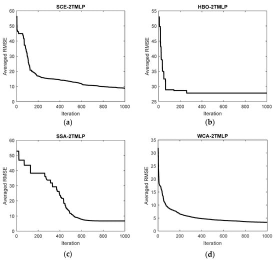As explained, training using the metaheuristic algorithm is iterative. The number of iterations is determined based on the behavior of the algorithm. This study considered 1000 iterations for all 4 models. During each iteration of the optimization, the metaheuristic algorithm explored the training data and tuned the mentioned 128 weights and biases accordingly. The 2TMLP was then reconstructed using the tuned weights and biases and performed one prediction for all training data. To investigate the quality of the results, a cost function was required in this step. The RMSE was calculated for each iteration. Since a double-target network was being trained here, an average of the RMSEs calculated for TDA and DDA was considered as the cost function.