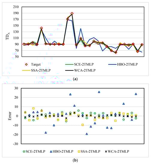 The RMSE values calculated for the SCE-2TMLP, HBO-2TMLP, SSA-2TMLP, and WCA-2TMLP were 2.66, 9.28, 2.94, and 0.81, respectively. In addition, the MAEs were 3.01, 12.71, 3.68, and 1.17. These error results, along with the CRs of 99.40%, 88.43%, 99.05%, and 99.90%, indicate a reliable prediction for all models and show the superiority of the WCA-2TMLP.
