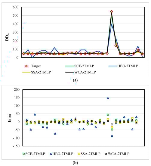 A analysis (in both phases), the order of the algorithms from strongest to weakest was: (1) WCA-2TMLP, (2) SCE-2TMLP, (3) SSA-2TMLP, and (4) HBO-2TMLP. However, the outcome was different for the DD